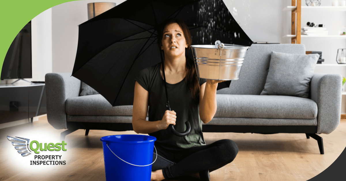 Woman sitting on the floor with an umbrella catching water leaking from the ceiling.