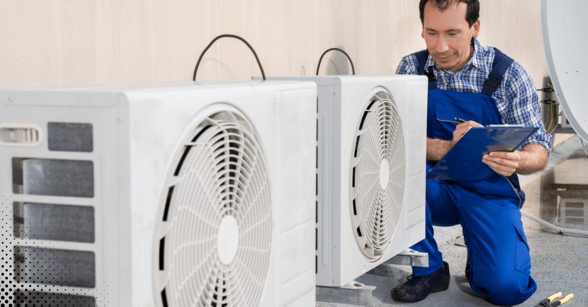 Technician inspecting outdoor HVAC units with a clipboard.Add Smart Tech For Extra Peace Of Mind